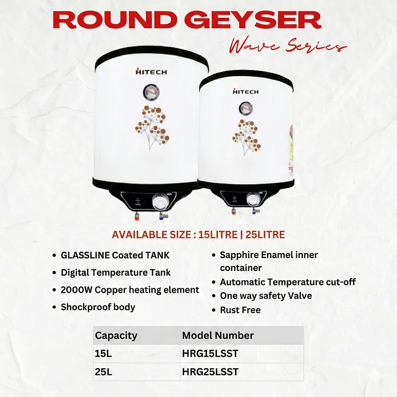 Hitech Malaysia Wave Series 15 Litre Round Electric Water Geyser – Hitech Wave Series Round Electric Water Geyser HRT-15LSST