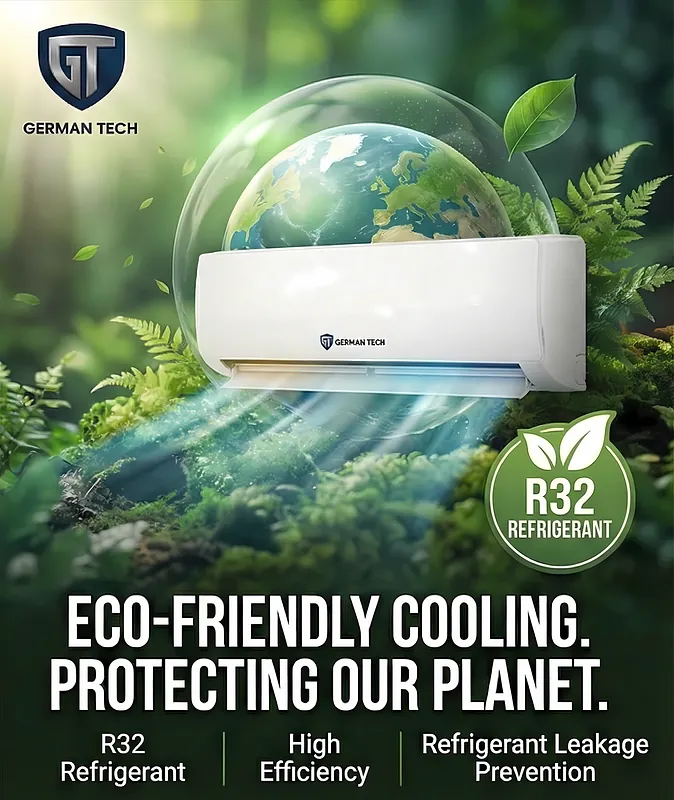 Engineered for the Nepal Environment (Golden Fin & 100% Copper) Most AC units fail prematurely due to gas leakages caused by pipe corrosion. German Tech eliminates this worry. We use 100% Pure 3M Copper Piping, which provides superior heat exchange and high-pressure resistance. To further protect the unit, our Golden Fin technology applies an anti-corrosive nano-coating to the condenser and evaporator. This repels water, prevents rust from humidity, and ensures that even after five monsoons, your AC performs like day one.