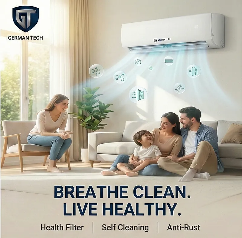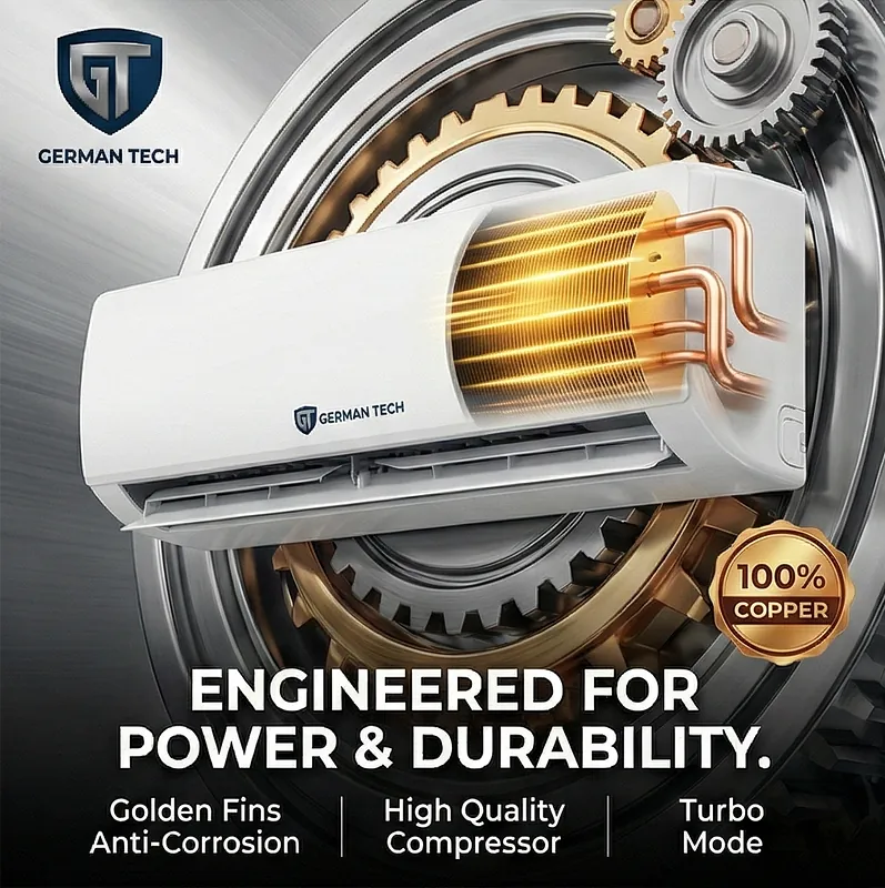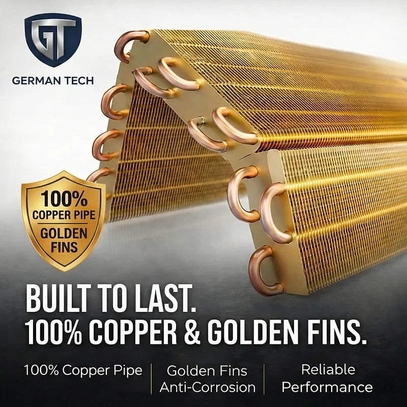 Engineered for the Nepal Environment (Golden Fin & 100% Copper) Most AC units fail prematurely due to gas leakages caused by pipe corrosion. German Tech eliminates this worry. We use 100% Pure 3M Copper Piping, which provides superior heat exchange and high-pressure resistance. To further protect the unit, our Golden Fin technology applies an anti-corrosive nano-coating to the condenser and evaporator. This repels water, prevents rust from humidity, and ensures that even after five monsoons, your AC performs like day one.