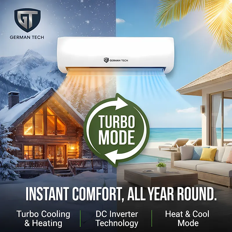 Year-Round Utility: The Hot & Cold Advantage Why buy a heater for winter and an AC for summer? The German Tech GT-1Ton-Inverter-Eco is a 2-in-1 solution. The Heat Pump technology is significantly more energy-efficient than traditional electric rod heaters, making it the smartest way to keep your family warm during the Himalayan winters.