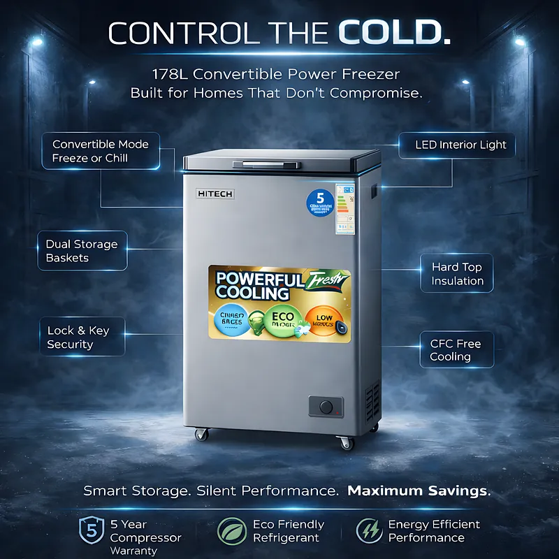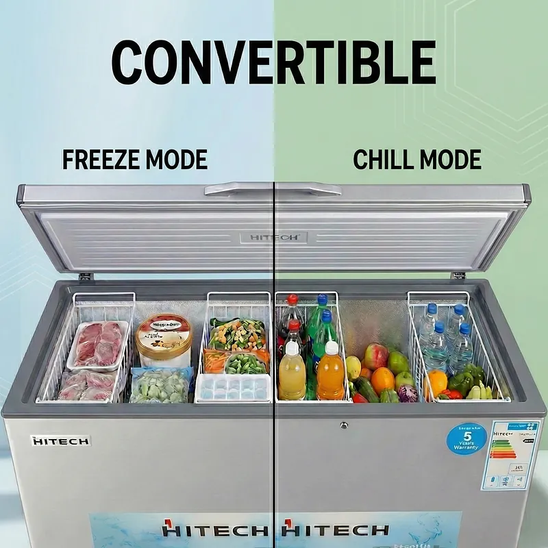 Why limit yourself to just a freezer or just a refrigerator when you can seamlessly have both? The standout feature of this Hitech Malaysia appliance is its intuitive Convertible Mode. With a simple turn of the front-facing temperature control dial, you can transition the unit from a high-powered “Freeze Mode” (ideal for preserving raw meats, frozen meals, and bulk ice) to a gentle “Chill Mode” (perfect for keeping dairy, fresh produce, and party beverages perfectly crisp). This 2-in-1 versatility ensures that as your storage needs change with the seasons, your appliance effortlessly adapts with you.