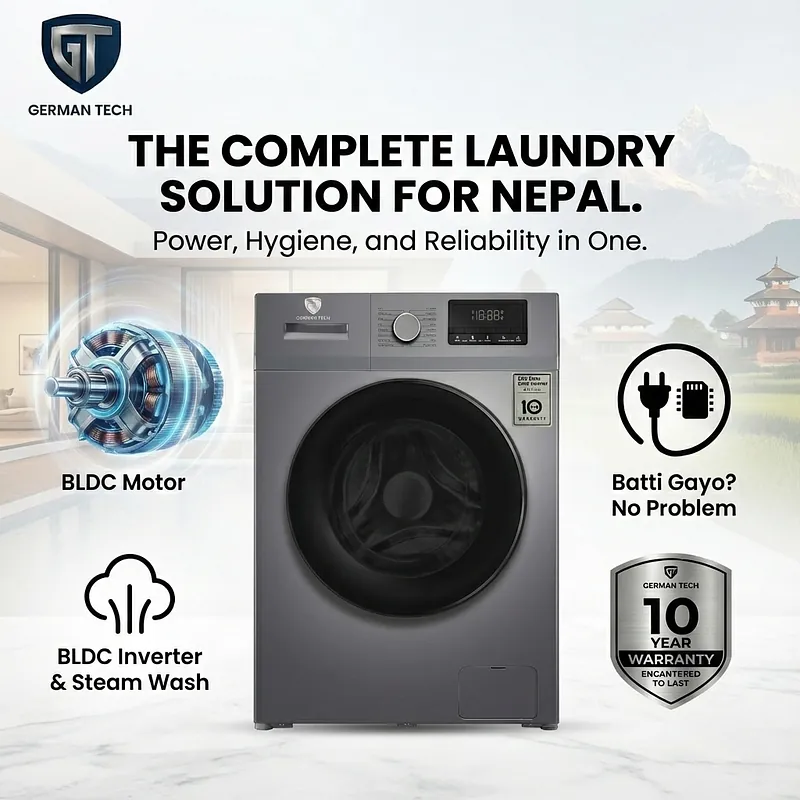 Stop washing clothes with hands and upgrade your laundry game with German Tech’s 8 kg Front Load Inverter Washing Machine — the perfect blend of performance, convenience, and sleek design for modern Nepali homes. Spend less time washing and more time living.