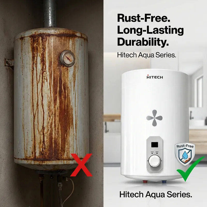 Built to Last in Local Conditions Water quality can be a major challenge for home appliances, but the Hitech Aqua Series is built to endure. It features a Glassline Coated Tank and a Sapphire Enamel inner container. These dual protective layers act as a shield against rust and mineral buildup, ensuring your geyser remains Rust Free even in areas with hard water. This robust construction is why it is widely recognized as “Nepal’s Choice for Every Season”.