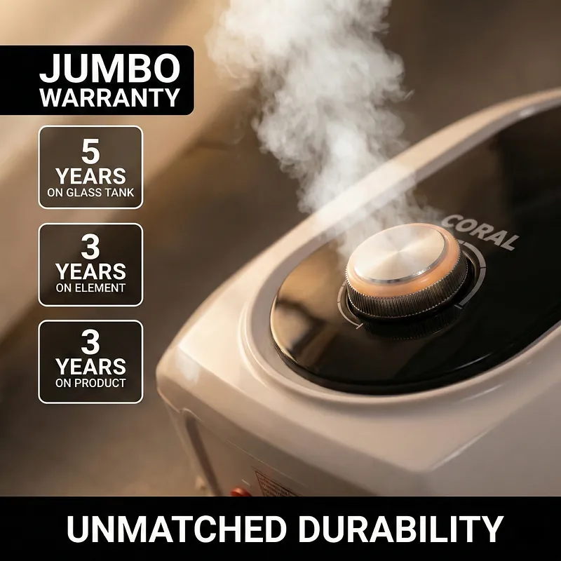 Industry-Leading Energy Efficiency In an era of rising costs, the Coral Series stands out by helping you save where it matters most. This geyser is engineered to save over 45% electricity compared to standard storage models. By utilizing superior thermal insulation and “Smart Technology,” it retains heat longer and consumes less power to reach your desired temperature, making it a “Powerful yet Economical” addition to your home.